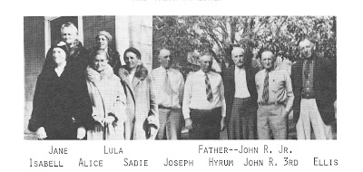 He and his wife Emma were the parents of 10 children: Emma Jane born 1874; Mary Isabell born 1875; Margaret Alice born 1877; John Jr. born 1879; Hyrum born 1882; Sarah born 1884; Arnold born and died in 1887; Lula born 1888; Ellis born 1891; and Joseph born 1894. Nine of these children lived to maturity, married and had families. In 1957 he had 160 living descendants into the fourth generation, and many more great-great-grandchildren.
